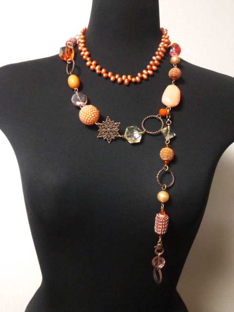 No.8 ネックレス 15800円 時計 9900円 (ブレスレットのみ7900円) イヤリング 2900円 (淡水パール、アメリカンビーズ、ヴィンテージビーズ等を使用) (ブレスレットを繋げると色々とアレンジできます) |