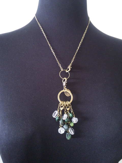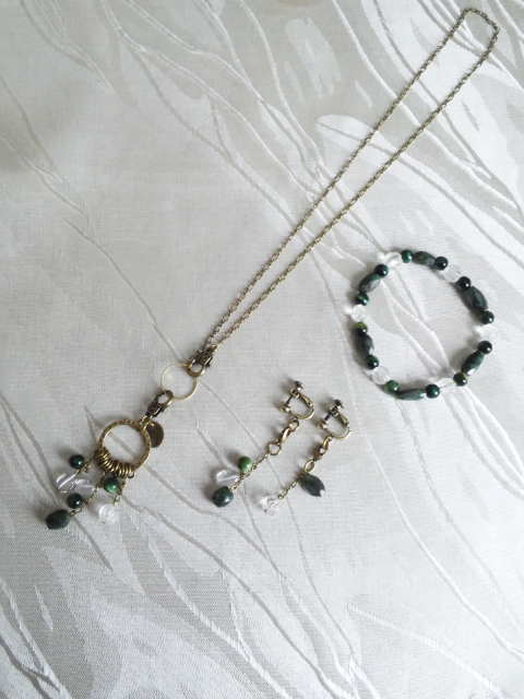No.12 ネックレス 7900円 ブレスレットM 15800円 イヤリング 8900円 (エメラルド、水晶、グリーンタイガーアイを使用) (イヤリングがはずれるので、アレンジできます) |